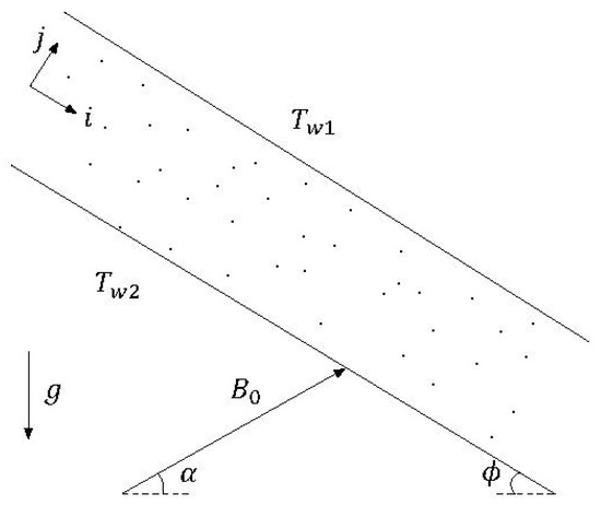 The schematic configuration of the considered system is given in Figure 1. The inclined channel filled with nanofluids is exposed to magnetic field . Under these assumptions the nonlinear coupled differential equations governing the system can be written as Equations (1) and (2).