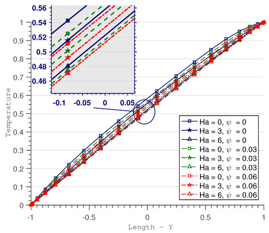 Figure 2 shows the temperature variation is almost linear with respect to non-dimensionalized channel width and decrease with increasing magnetic field intensity. The fluid temperature decreases increasing the value of Ha within the channel due to increasing magnetic field intensity. This behavior is attributed to decrease the fluid velocity due to the magnetic field.