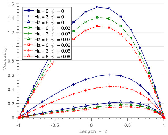 Figure 3 shows the effect of Hartmann number on the velocity profile. It is clear that, increasing the value of Ha have a tendency to slow down the fluid motion because of the presence of the transverse magnetic field. Transverse magnetic field creates a resistive force similar to the drag force, which acts in the opposite direction of the fluid motion. The velocity of the fluid decreases with resistive force and it is clear that the applied magnetic field has a retarding effect on the flow field. This is also the case for fluids without nanoparticles but results show that for a concentration of , the magnetic field braking effect increases when compared to the case of no particles, i.e., .