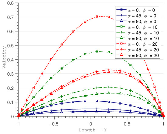 As mentioned above, the main parameter to be utilized in order to achieve more dominance over the behavior of the flow is the magnetic field angle . To further differentiate the effect of magnetic field and gravitation over the flow, the magnetic field angle is offered to be independent from the angle of the channel. This could be a good modeling approach for the problems where the channel has a fixed inclination while the magnetic field can be directed independently. An example case could be an medical application where the veins should not be moved while the magnetic field applied from outside could be changed in favor of the application.