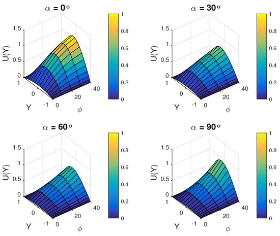 Figure 5 is a broader look at the trend of the effect of and on flow velocity, by showing 3D figures representing the change of flow velocity with respect to inclination of the channel for four different magnetic field angle . The results discussed until now can be seen in this figure as well as a trend in change in shape of the surface for different values of magnetic field angles .