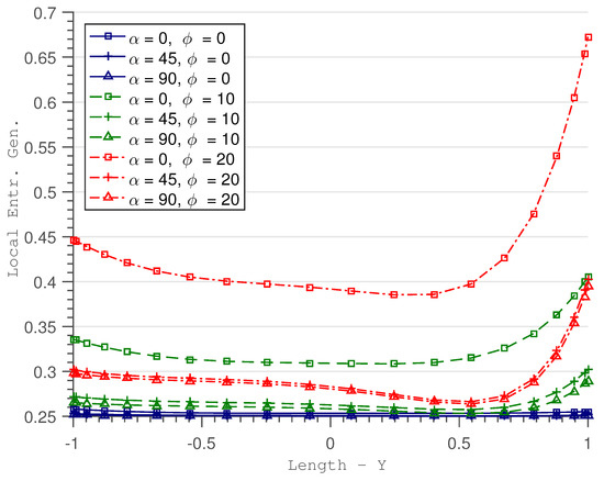 Engineering system design is a complicated process and most of the times requires comprise from one property or another. A wise choice to tune in between favorable properties, there are various optimization methods. One of them is to calculate and minimize the entropy generation. The influences of the different parameters on entropy generation within the channel are presented in Figure 6, Figure 7, Figure 8 and Figure 9. It is seen from Figures that the entropy generation depends on magnetic field angle, channel inclination. Using the local non-dimensional entropy generation rate formula for nanofluid in the presence of magnetic field is given in Equation (26), local entropy generation for a variety of and for 2, and given in Figure 6. It shows that the entropy generation trend changes heavily for different channel inclination angle . A change in magnetic field angle may also effect the entropy generation abruptly. When the magnetic field angle is increased, a decrease in entropy generation is observed in Figure 6. But this effect gets nearly negligible for higher values of magnetic field angle. This can be checked by investigating the distance in between the local entropy generation curves for –45° and –90°. Furthermore, addition of nanoparticles decrease the local entropy generation but does not change the effect of and on the local entropy generation. Here only the trend for is given but in the course of the study, the effect of and on the local entropy generation is investigated for but not all given due to the page constraints.