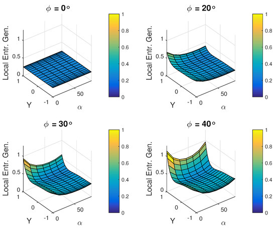 To gain further insight about the behavior of local entropy generation as a function of magnetic field angle and channel inclination, four 3D graphes are presented as Figure 7. In this simulation and . These four surfaces in Figure 7 present the change of local entropy generation with magnetic field angle for four different channel inclinations . It can be seen from the upper left surface corresponding to , the change in magnetic field angle does not help much to decrease the local entropy generation. But for channel inclination , local entropy generation is decreased for higher values of . For higher values of , , an increase in first results in a decrease in local entropy generation. But after some specific value, the local entropy generation starts to increase for increasing . This can be seen also from Figure 8, where local entropy generation is averaged along the width of channel and no longer dependent on the location, namely total entropy generation. Those result means that magnetic field angle can be used to decrease local entropy generation but depending on the inclination of the channel, this might be the contrary. This means that the user can utilize these behavior to optimize the system depending on the perquisites of the problem. Another result observed is that this behavior is not changed for nanoparticle volume fraction . But for larger , a general decreasing effect is seen in the simulations for all values of and .