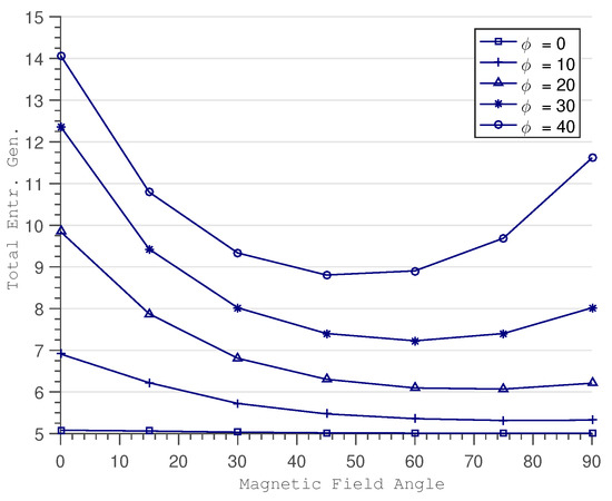 Total entropy generation as a function of magnetic field angle for a variety of channel inclination .