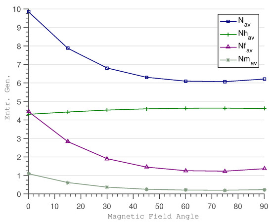 A further investigation given in Figure 9 on the total entropy generation concerns the visualization of entropy generation terms separately. As seen from Equation (25), the entropy generations is comprised of entropy generation due to heat transfer irreversibility, entropy generation due to fluid friction irreversibility and entropy generation due to magnetic field. Figure 9 shows that the decrease in total entropy generation via an increase in magnetic field angle belongs to viscous dissipation and magnetic field terms of entropy generation. The entropy generation term due to heat transfer irreversibility remains nearly unchanged. To achieve a further decrease in entropy generation, this terms might be handled with a different controllable parameter.