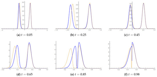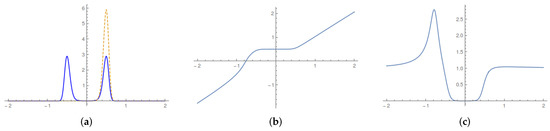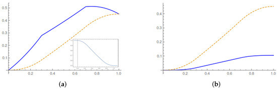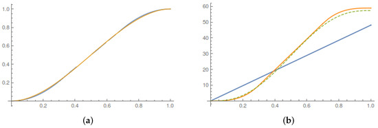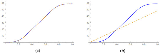 Qualitative comparison of universal part of the running Lagrangian maps (32) (continuous curve, blue on line) and (40) (dashed curve, orange on line), Figure 6a. In (40), we choose , . Figure 6b evinces, as to be expected, the qualitatively equivalent behaviors of the entropy production for finite value () of the switching time. The dashed green line is computed from (40). The continuous blue line is the lower bound for the transition as predicted by [7]. (a) ; (b) Running entropy production.
