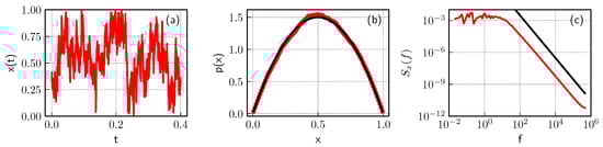 Excerpt of a time series (a), obtained by solving SDE (4) with given by Equation (6); (b) PDF and (c) PSD of the same time series (red curves). Black curves in (b,c) represent theoretical fits: (b) beta distribution with parameter values two and two; (c) trend line. Parameter set used in numerical simulation: , .