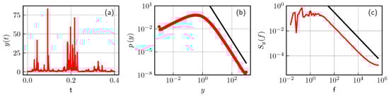 Excerpt of the transformed time series (a), where the time series is the same as in Figure 1; (b) PDF and (c) PSD of the same transformed time series (red curves). Black curves in (b,c) represent theoretical fits: (b) trend line and (c) trend line.