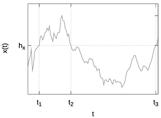 In this paper, we consider two distinct threshold passage events: one describes return to the threshold from above, while the other describes return to the threshold from below. We consider burst duration as the amount of time the series spent above the threshold. In Figure 3, the burst period lasts from the threshold passage at time until the next threshold passage at time . Hence, burst duration, in this case, is given by . Evidently, it is the same as the first return time, but with the restriction that the return was made from above the threshold. In Figure 3, the inter-burst period lasts from the threshold passage at time until the next threshold passage at time . Hence, inter-burst duration, in this case, is given by . Evidently, it is the same as the first return time, but with the restriction that the return was made from below the threshold.