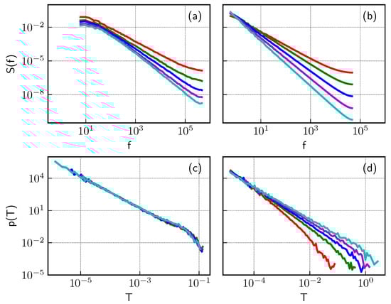 We demonstrate in Figure 4 this clear distinction of fBm and SDE by numerical comparison of signal PSD and PDF of T. As can be seen in Sub-figures (a) and (b), we have selected parameters of both models, so that we obtain similar PSDs (with the same exponents ). Yet, PDFs of the burst duration are different for the considered models (Sub-figures (c) and (d)). While the burst duration PDFs are the power-law in both cases, the exponent differs. For the case of SDE (8), we have the same exponent for all cases, constant at , as predicted by Equation (15); while for the fBm case, we have differing exponents, which coincide with predictions, , by Equation (12). Exponential cutoffs are present in both cases, as models are mean reverting. Thus, the statistical analysis of burst and inter-burst duration in empirical time series could reveal whether empirical time series contain true long-range memory or spurious memory, which originates from non-linear Markov stochastic processes.
