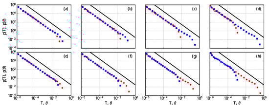 PDFs of burst (red circles) and inter-burst (blue squares) durations of time series, obtained by solving SDE (4) with given by Equation (6), for various thresholds: (a), (b), (c), (d), (e), (f), (g) and (h). Parameter set used in numerical simulation: , . Solid black lines guide the eye according the power-law .