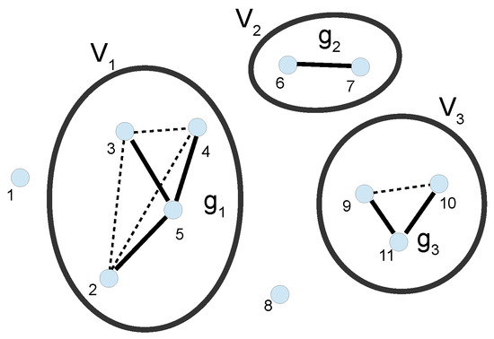Visualization of the partition in (19) for non-intersecting sets , , in each of which we display by solid lines the connected graphs , .