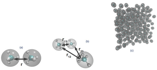 A main goal of this work, as mentioned before, is to examine the parameterization of a coarse-grained model using the cluster expansion formalism described above for simple realistic molecular systems; in this work, we study methane and ethane in various density and temperature regimes. We refer the reader to the Supplementary Material for the atomistic models, as well as their coarse-graining through the cluster expansion formalism. In order to clarify the notation, we refer to Figure 1; for the three-body clustering case, each set is composed by exactly three interacting CG molecules (dots connected with solid lines). The centres of mass (COM) of the set i is located at and associated with .