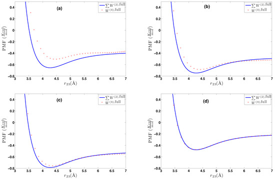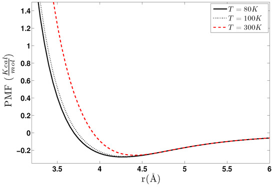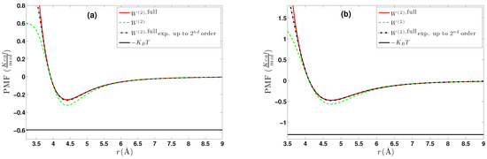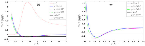 - A calculation of the PMF using the constraint force approach, , as described in Section 4.2.1. Alternatively, through the same set of atomistic configurations, the two-body PMF, , can be directly calculated through Equation (24).