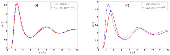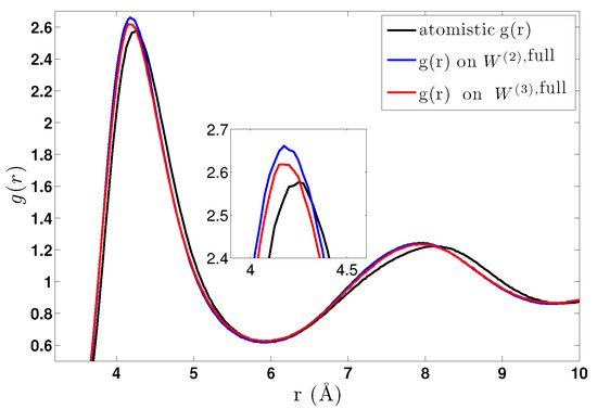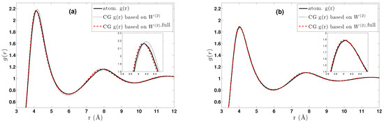 Given the atomistic “target” from a free (i.e., without constraints) atomistic run, by inverting (11) and neglecting the higher order terms of , one can obtain a first candidate for a pair coarse-grained potential . Then, one calculates the that corresponds to the first candidate and by iterating this procedure eventually obtains the desired two-body coarse-grained potential. This scheme is based on the theorem that if there exists a pair CG interaction that reproduces the target , this is unique [63]. However, this is only an approximation (accounting for the neglected terms of order and higher in the expansion of ) since we know that the “true” CG interaction potential should be multi-body, as a result of integrating atomistic degrees of freedom. Hence, having agreement on , within numerical accuracy, does not secure proper thermodynamic behaviour, and several methods have been employed towards this direction; see, for example, [7,40,52] and the references within.