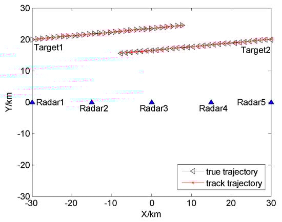 We adopt the sequential importance resampling particle filter (SIR-PF) algorithm [33] to achieve the state estimation for each target. Figure 2 depicts the true trajectories and track trajectories of two targets with respect to the radar network.