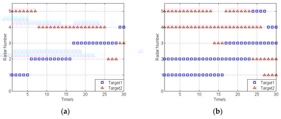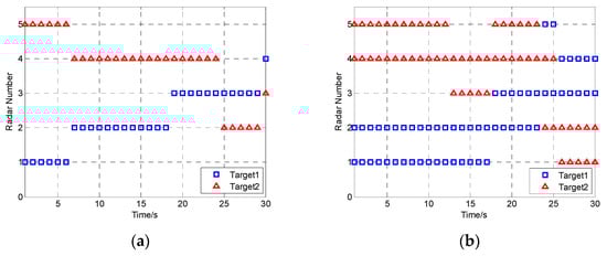 The target assignment results: (a) The second bandwidth model, a single radar assigned to each target; (b) The second bandwidth model, two radars assigned to each target.