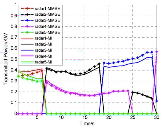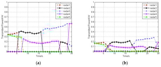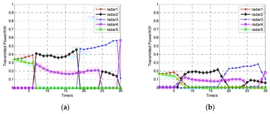 It can be seen from Figure 3 that during the tracking process, with the target movement, radars that are closest to the target are assigned as active radars to track this target. Figure 4a illustrates the results of power allocation in the case of single radar assigned to each target. Figure 4b illustrates the results of power allocation in the case of two radars assigned to each target.