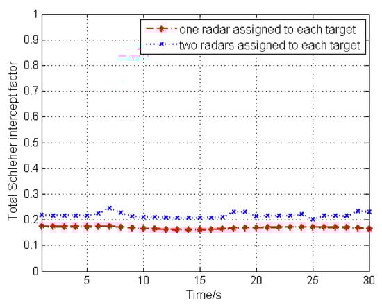 The results of Figure 5 prove that the case of single radar assigned to each target can achieve a smaller total Schleher intercept factor for the radar network than the case of two radars assigned to each target. In traditional radar networks, each radar has a constant transmitted power of 6 KW. Compared to the total Schleher intercept factor of traditional radar network, which is equal to 5, a significant reduction of Schleher intercept factor can be achieved by adopting the LPI optimization algorithm of this paper in both cases. That is, the LPI performance of radar network can be effectively improved in both cases compared with a traditional radar network.