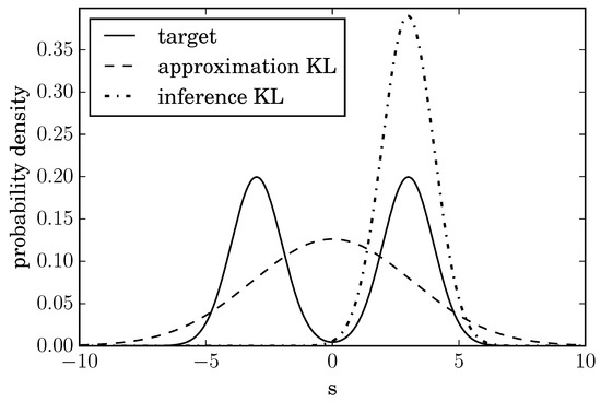 In Reference [11], it is claimed that minimizing the inference KL yields more desirable results since for multi-modal distributions, individual modes can be fitted with a mono-modal distribution such as a Gaussian distribution, whereas the resulting distribution has a very large variance when minimizing the approximation KL to account for all modes. In Figure 1 there is an example of this behavior. The true distribution of the quantity s is taken to be a mixture of two standard Gaussians with means . It is approximated with one Gaussian distribution by using the approximation KL and the inference KL. When using the approximation KL, the resulting distribution has a large variance to cover both peaks. Minimizing the inference KL leads to a sharply peaked approximation around one peak. A user of this method might be very confident that the value of s must be near 3, even though the result is heavily dependent on the initial condition of the minimization and could have become peaked around just as well.