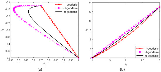 From the viewpoint of flatness, the manifold S of exponential family is dually flat with respect to . We can know from [19] that any - or 1-geodesic on S is a straight line with respect to the corresponding affine coordinate system. Thus, in terms of the and coordinates, the -geodesics and connecting any can be expressed by