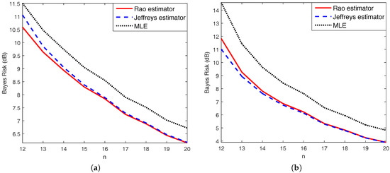 Using Proposition 5 again, we know that the right-hand side of the second equality above is constant on the sample space. Thus, the posterior expected Rao losses of , and are equal to their Bayes risks under Rao loss that average the Rao loss functions over both sample space and parameter space. Similar consequences can be deduced for the posterior expected Jeffreys losses of , and their Bayes risks under Jeffreys loss. It is still difficult to seek an explicit expression for the posterior expected Rao loss. Hence, a Monte Carlo simulation is used with 1000 trials to calculate the Bayes risks under Rao loss. The comparisons are illustrated in Figure 3.