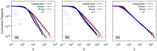Numerical construction of the complementary cumulative distribution function of the random variable (7) or equivalently (10) in the limit of large t or n, for independence (black), Kesten dependence (red) and mixed dependence cases (blue) with (a) ; (b) and (c) . Following expression (13), the tails are consistent with the expected values of the exponents , and , respectively, regardless of the dependence type, as shown by the straight grey lines.
