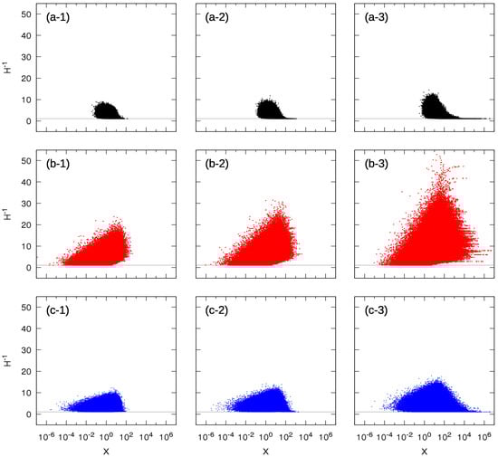 Relationship between the inverse Herfindahl index and the sum X of sizes where the three rows correspond to the three cases of dependence and the three columns correspond to three different values of : (a-1) independence with ; (a-2) independence with ; (a-3) independence with ; (b-1) Kesten dependence with ; (b-2) Kesten dependence with ; (b-3) Kesten dependence with ; (c-1) mixed dependence with ; (c-2) mixed dependence with and (c-3) mixed dependence with . The horizontal grey lines indicate . Focusing on large values of X, corresponding to the power-law tail of the distribution function , only one entity contributes to the total size of the system in the independence case, but, in the Kesten dependence case, the total size is always due to the contribution of several entities (see text).