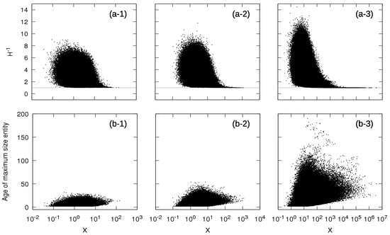 For the independence case, it is interesting to mention that, in addition to the fact that only one entity is responsible for the whole system size X, the age of this maximum size entity is a stochastic variable. This means that the product term that builds the power-law tail of varies as a function of time in its number of multiplicative growth factors, i.e., it does not have the same number of factors at all time steps. Figure 4 shows the age of the entity with maximum size against the total size X of the system for the independence case with (panel b-1), (panel b-2) and (panel b-3): there is a broad distribution of ages of the maximum size entities for large values of X and not a unique age. This observation suggests that the power-law behavior in this case results from the superposition of the statistics of single multiplicative processes at different ages with appropriate statistical weights, as in the superstatistics mechanism mentioned in the introduction [14,15,16]. It is notable that studies following similar ideas with exponential weights established the so-called double Pareto distribution, with power-law tail [41,42].