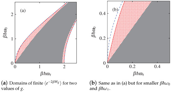 Domains of convergence/divergence for under a sudden quench protocol from ω0 to ωτ, which is applied to a quantum harmonic oscillator. The Husimi coefficient is given by . Here and denote the initial and final dimensionless angular frequencies , of the oscillator scaled by , which is prepared initially at thermal equilibrium at the inverse temperature β. For g = 1, the second moment is finite only in the gray regime. For g = 0.1 the domain for finite has grown to include the (red) patterned regimes as well. The (blue) dashed line is given by Equation (34), independent of g. Note that this line almost exactly overlaps with the boundary of the (red) patterned domain in the lower right corner in (a). The part (b) depicts a zoom into the parameter regime of smaller dimensionless angular frequencies.