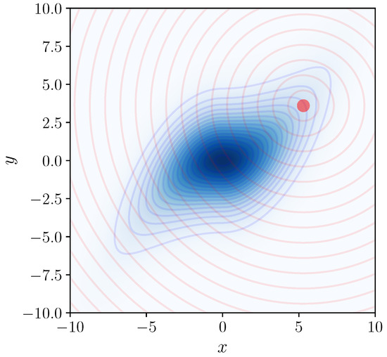 To evaluate the log-probability (or density) of the blue probability distribution near the red point, Nested Sampling can be used, with the blue distribution playing the role of the “prior” in NS, and the Euclidean distance from the red point (illustrated with red contours) playing the role of the negative log-likelihood. Averaging over selections of the red point gives an estimate of the entropy of the blue distribution.
