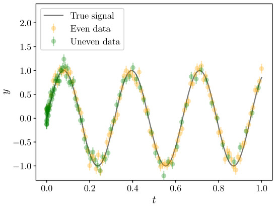 That is, the data is just the signal observed at particular times , with Gaussian noise of standard deviation 0.1. The amplitude of the sinusoid is very likely to be around 10 times the noise level, and the period is between 0.1 times and 1 time the duration of the data. An example signal observed with the even and uneven observing schedules is shown in Figure 2.