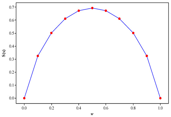 According Rocha et al. [49], among the many desirable properties of the Shannon entropy index, we can highlight: (a) the entropy of a probability distribution representing a completely certain result is 0, and the entropy of any probability distribution representing uncertain results is positive; and (b) its measure is concave. Property 1 is desirable, since the entropy index guarantees non-zero solutions. Property 2 is desirable, therefore, it is much easier to maximize a concave function than a nonconcave function [47]. Figure 1 shows these properties of the entropy, as calculated by Equation (15).