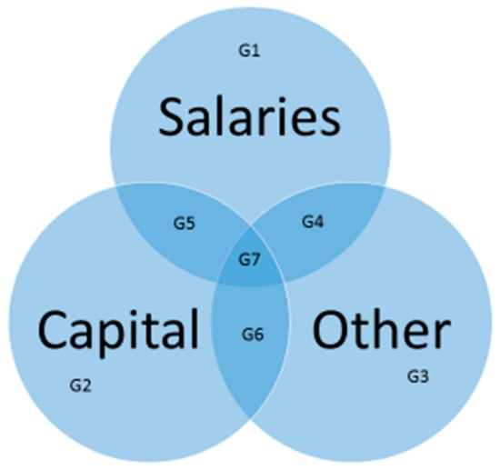 The income of an individual in a population has three possible sources: salary, capital, or other sources like pensions, unemployment benefits, and social assistance. In Romania, every person who was registered as having earned an income during 2014 earned money from one, two, or three of these sources. In these conditions, the total population having an income during 2014 was divided into the following seven categories of persons (Figure 1): persons who had their income only from a single source of income (G1—salaries, G2—capital, and G3—other sources of income), persons who earned income from two income categories (G4—salaries and other sources, G5—salaries and capital income, and G6—capital income and other sources of income), and persons who earned money from all three income sources (G7). Figure 1 shows the nature of the different incomes associated with individuals in the different categories, G1 to G7.