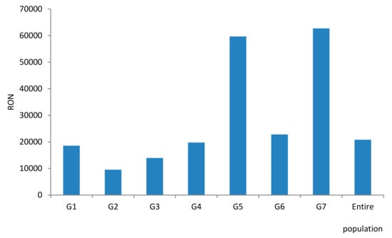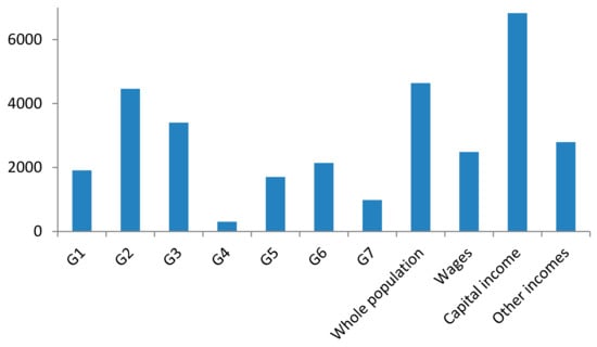 The structure of incomes and across the population shows that (i) 44% of people who earned wages earned 56% of the total income of the population; (ii) 23% of people have earned capital income and these represent 19.5% of the total income of the population; (iii) 33% of people also earned other types of income, accounting for 24.4% of the total income of the population; (iv) Figure 2 shows the shares of income and the number of people in the seven groups—these results show that there are significant differences between the two data series; and (v) the significant differences between income shares and the number of people in the seven groups are materialized by different yearly average earnings of persons belonging to one of the seven groups of persons (Figure 3).