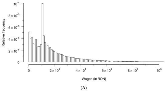 We use gross annual income computed from tax records data at the individual level for 2014. We distinguish between three parts of the total income: wages, capital income, and other sources of income. The currency used for all incomes in the current paper is the Romanian “leu”—RON. The first part of the income can be attributed to labor (domestic and abroad). The second part, capital income, comes from dividends, interest on deposits, rents, real estate transfers, etc. The third part of the income comes from pensions, social assistance, unemployment benefits, income from agricultural labor, freelance activities, and intellectual property rights. Our data sets have 11 million records and were processed using R software [46,47].
