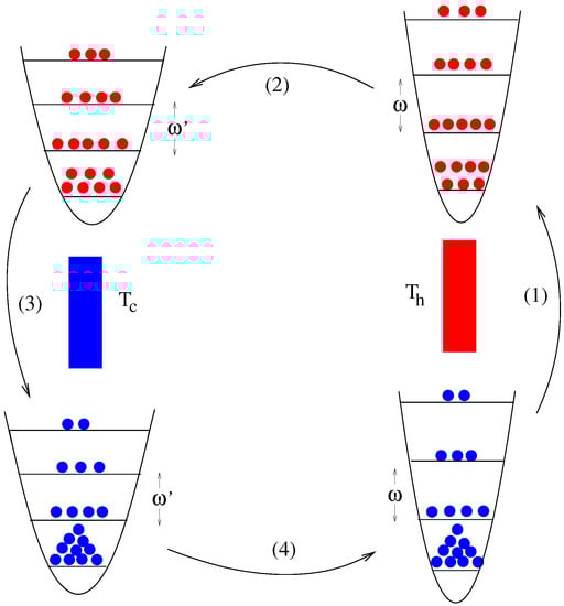 Here, we consider a four-staged Otto cycle. As an example, harmonic oscillator as the working medium of a quantum Otto cycle is pictorially described in Figure 1. The four stages of the cycle are: