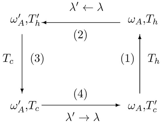 Now consider a cycle in which the global parameters and or and are varied in the adiabatic branches instead of varying . Because of quadratic coupling, we can show that the total system consists of two independent subsystems, throughout the cycle. Then the total work is the sum of the contributions from its independent subsystems and therefore Equation (27) holds even when we change global parameters to extract work.