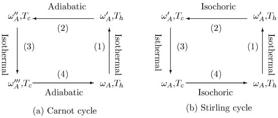 An isothermal process can be simulated by an infinite number of infinitesimal adiabatic and isochoric processes [43]. As discussed above, in the adiabatic and isochoric processes, the work and the heat contributions from individual subsystems can be identified separately. Therefore, the isothermal process of the total system can be considered equivalent to the isothermal processes of two independent subsystems taken together. To understand the generality of the bounds of the efficiency observed in Otto cycle, we can consider other cycles such as Carnot cycle consisting of two isothermal processes and two adiabatic processes, and Stirling cycle consisting of two isothermal processes and two isochoric processes [35,39,44] (see Figure 3). Like the Otto cycle, in the Stirling cycle, the global efficiency is bounded by the efficiencies of independent subsystems because at any stage of the cycle, the total system can be decomposed into two independent subsystems. This shows that the analysis on the bounds of the efficiency represented in Equation (22) is a generic one and applicable to some of the other cycles also. Using similar analysis, we can also show that for a quantum Carnot cycle, both the independent subsystems work at Carnot efficiency, which is same as the global efficiency, i.e., .