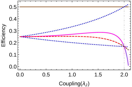 Equation (44) shows that when the coupling is introduced, the efficiency of the coupled oscillators goes above the efficiency of the uncoupled model (Equations (5) and (9)), while, according to Equation (45), the efficiency of the spin system lies below that of the uncoupled model (see Figure 7). Interestingly, Equations (44) and (45) shows the symmetric behavior of and about . This behavior is obvious due to the fact that coupling reduces the frequencies of the eigenmodes of the harmonic oscillators while it increases the energy level spacings of the independent spin systems.