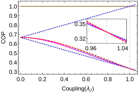 Since , by introducing the coupling, the COP of the coupled spins becomes higher than that of of the uncoupled spins, (Equaton (46)), while the COP of oscillators lies below . It is interesting to note that exactly the opposite behavior is observed in the case of heat engine (see Equations (44) and (45)) . This behaviour is shown in Figure 7.