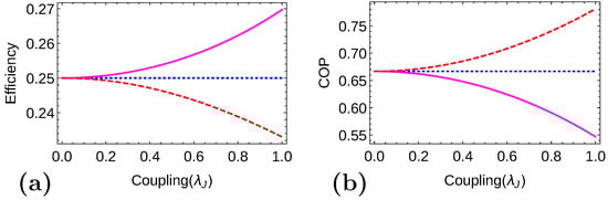 In each of the above two Equations (48) and (49), the first term on the right-hand side represents the COP of the uncoupled system. To compare the effects of coupling in COPs, we calculate the difference between and , which is given by