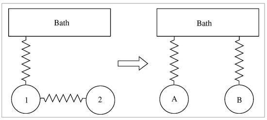 As mentioned in Section 2, the adiabatic processes should be done slow enough to avoid creation of coherence between the eigenstates of the Hamiltonian. These coherences create a frictional effect in the system, which in turn reduces the extractable work. The second assumption is that the system is attached to the respective baths for long enough time till the system attains equilibrium. Thermalization of coupled oscillators can be modeled with coupled micro-cavities as described in Reference [41]. In this model, one of the system (say system 1) is attached to a bath. Since the system 2 is coupled to the system 1, the total system can equilibrate with the bath. When we diagonalize the Hamiltonian of the coupled system, the independent systems A and B appear to be connected with the bath (see Figure 8). This method is applicable even for very strongly coupled systems.