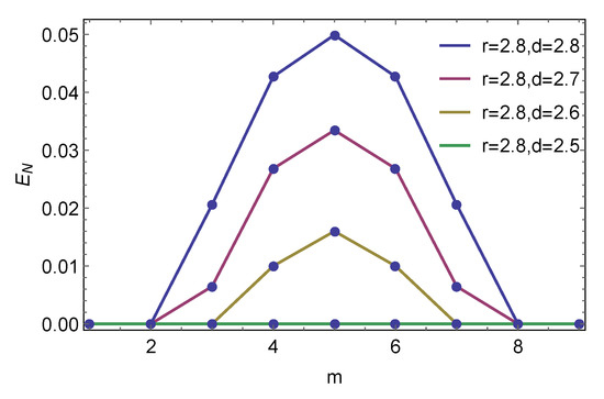Dependence of number m of group A on negativity (the massless conformal scalar field with ). The total number of detectors is with r = 2.8 H (super horizon scale). The maximum value of the negativity is attained for .