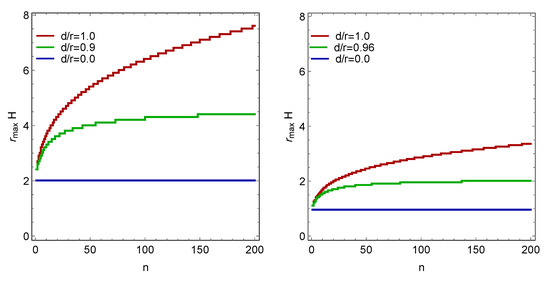 as a function of number of detectors n. Left panel: the massless conformal scalar field with . Right panel: the massless minimal scalar field with . For both types of scalar fields, with , exceeds the horizon scale 2 H as the number of detectors increases.