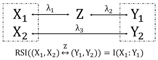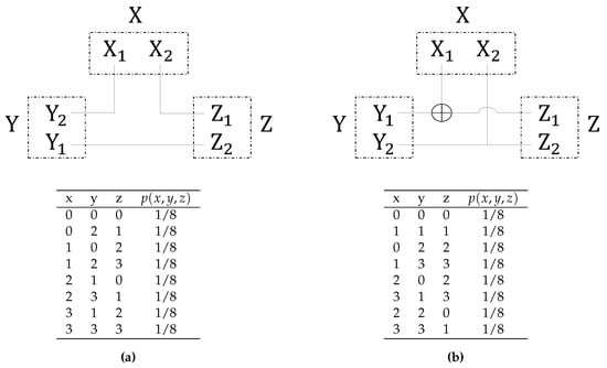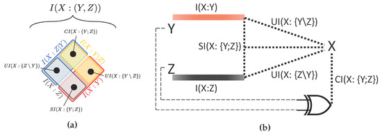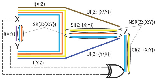 and share information via two parallel channels: one passes through Z, the other does not. The parameters control the correlations as depicted with the arrows. If we use the PID definitions in Ref. [11], we find that, in agreement with the interpretation in Section 6.2, here quantifies information between X and Y that also passes through Z, as it is equal to .