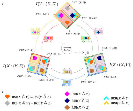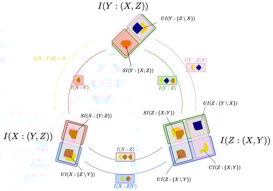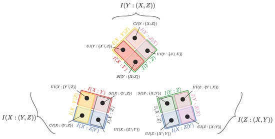 The three possible PIDs of a trivariate probability distribution that follow from the three possible choices for the target variable: on the left the target is X, in the middle it is Y and on the right it is Z. The coloured rectangles highlight the linear relationships between the twelve PID atoms and the six Shannon information quantities. Note that the orientations of the PIDs for and are rotated with respect to the PID for to highlight their reciprocal relations, as will become more apparent in Figure 4.
