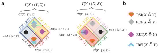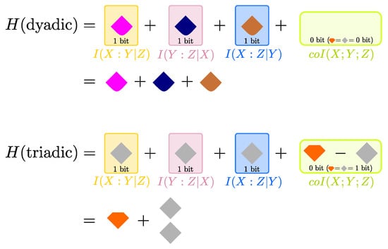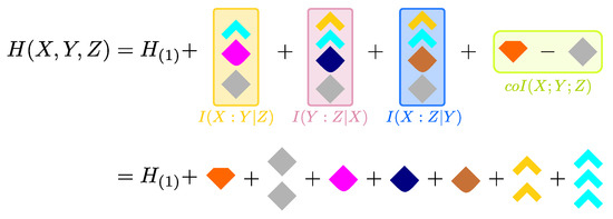 which is manifestly invariant under permutations of X, Y and Z, and shows that can be written as a sum of some of the 12 PID atoms. For example, expressing the co-information as the difference , we can arbitrarily use the four atoms from the left-most diagram in Figure 2 to decompose the sum and then add from the middle diagram to decompose . If we then plug this expression of in Equation (13), we achieve a decomposition of the full entropy of the system in terms of and PID quantities: