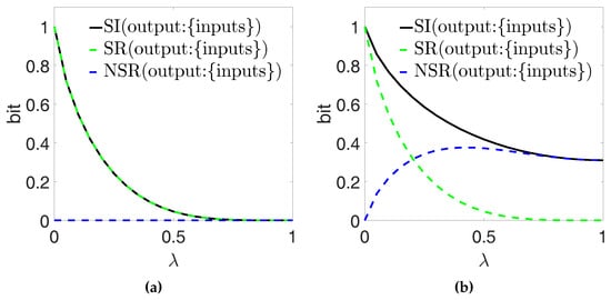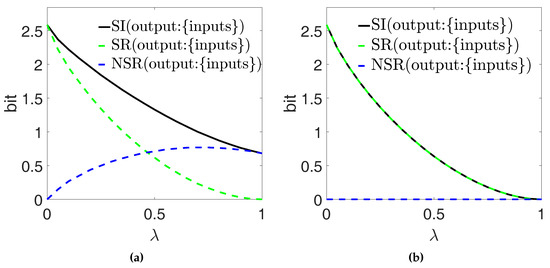 Consider a system where the correlations between two binary random variables, the inputs Y and Z, are described by the control parameter as in Section 6.1.1, but the output X is determined by the function as [22]. As the causal structure of the system would suggest, we consider the inputs Y and Z as the PID sources and the output X as the PID target, thus selecting the left-most PID diagram in Figure 2. Figure 9b shows our calculations of the full redundancy , the source redundancy and the non-source redundancy , based on the definitions in Ref. [11].