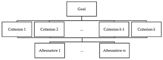 Structuring: Initially goal, criteria, and alternatives are determined. Then, the hierarchy model is constructed at different levels according to the structure of the problem. A three level-hierarchy, that has k criteria and m alternatives, can be given in Figure 1.